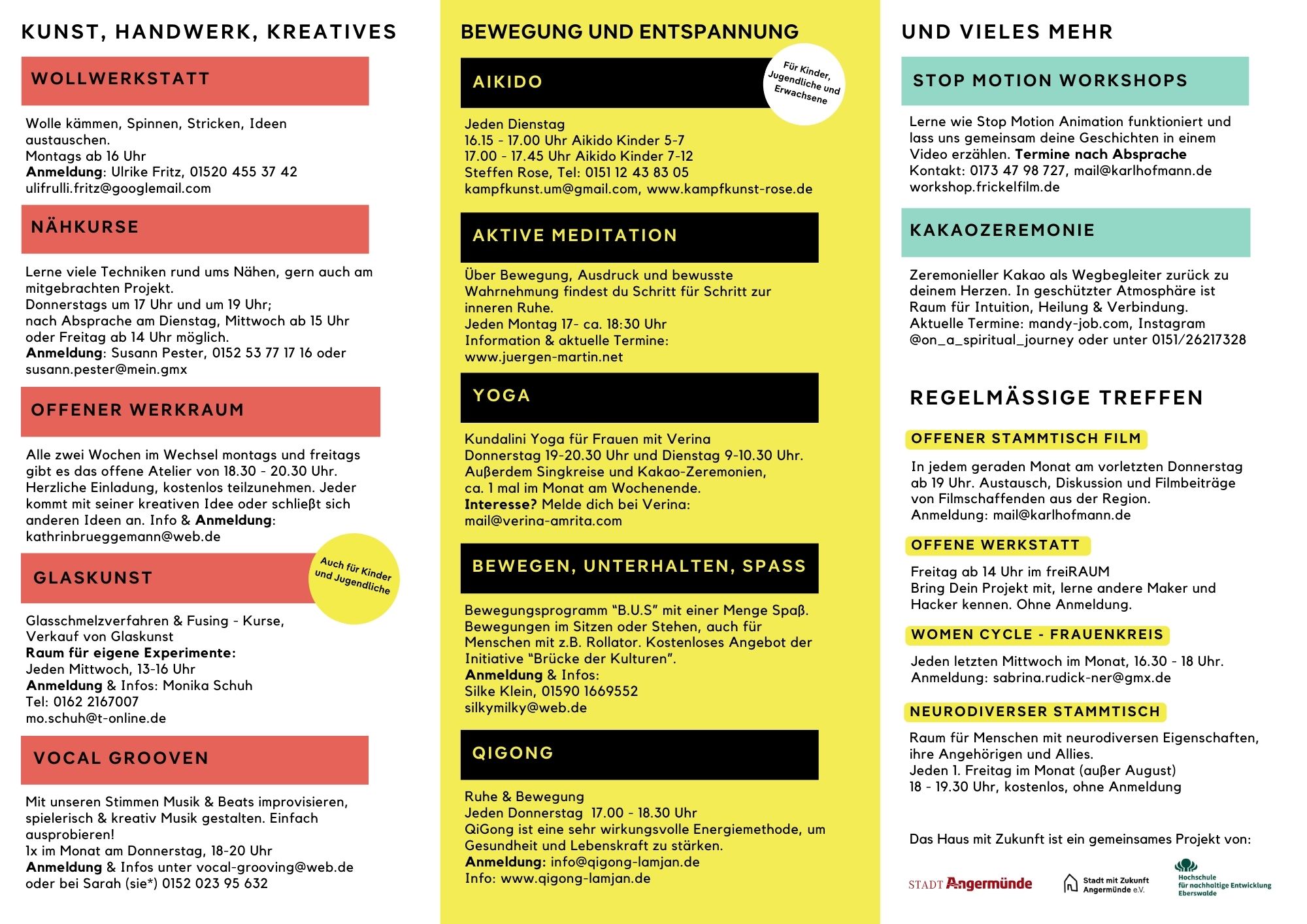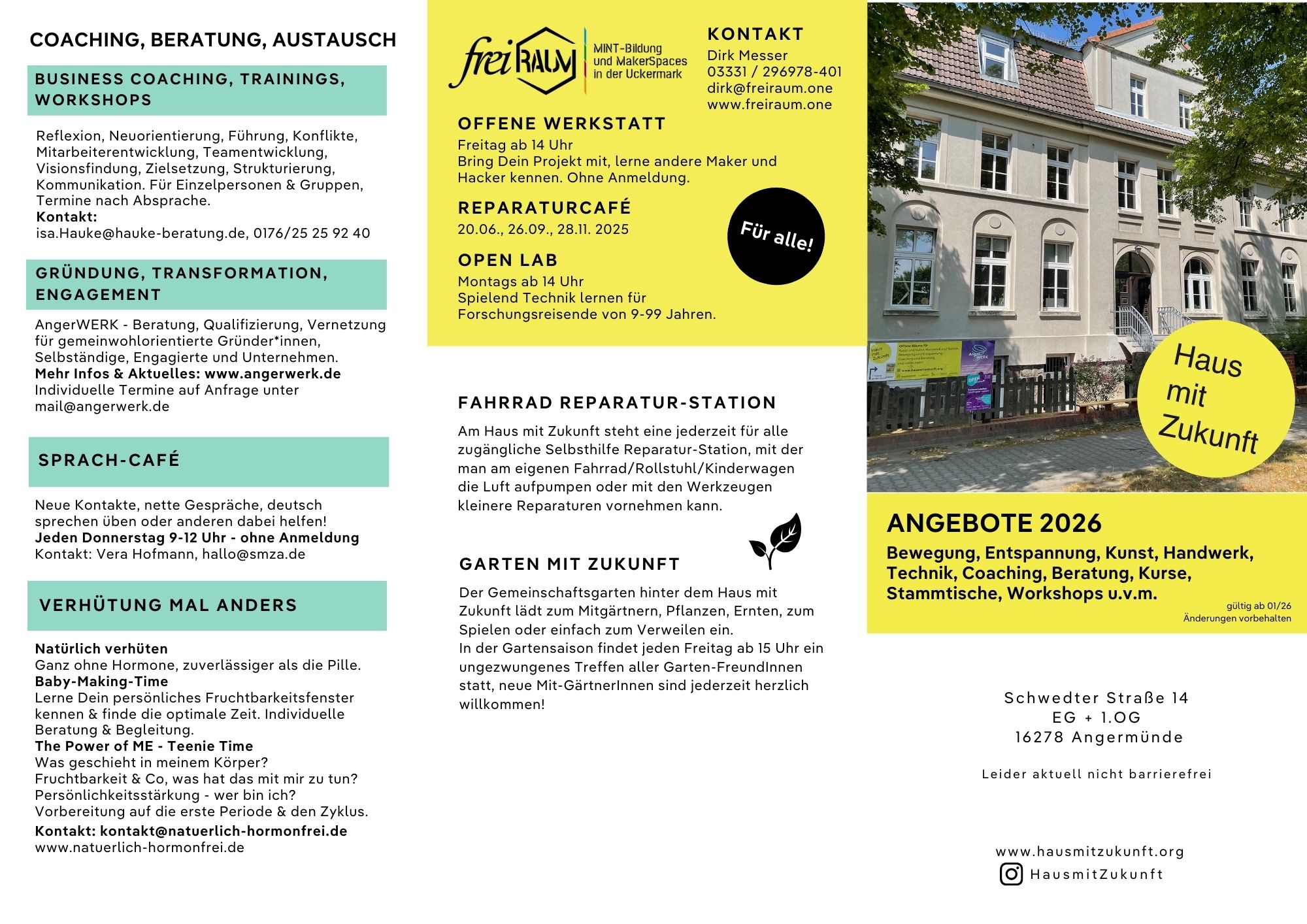Das Haus mit Zukunft in der Schwedter Straße 14 in Angermünde ist seit 2021 ein Begegnungsort für Menschen aus der Stadt und der Region. Kunst, Kultur, Bewegung, Entspannung, Arbeit und Ehrenamt finden hier zusammen.